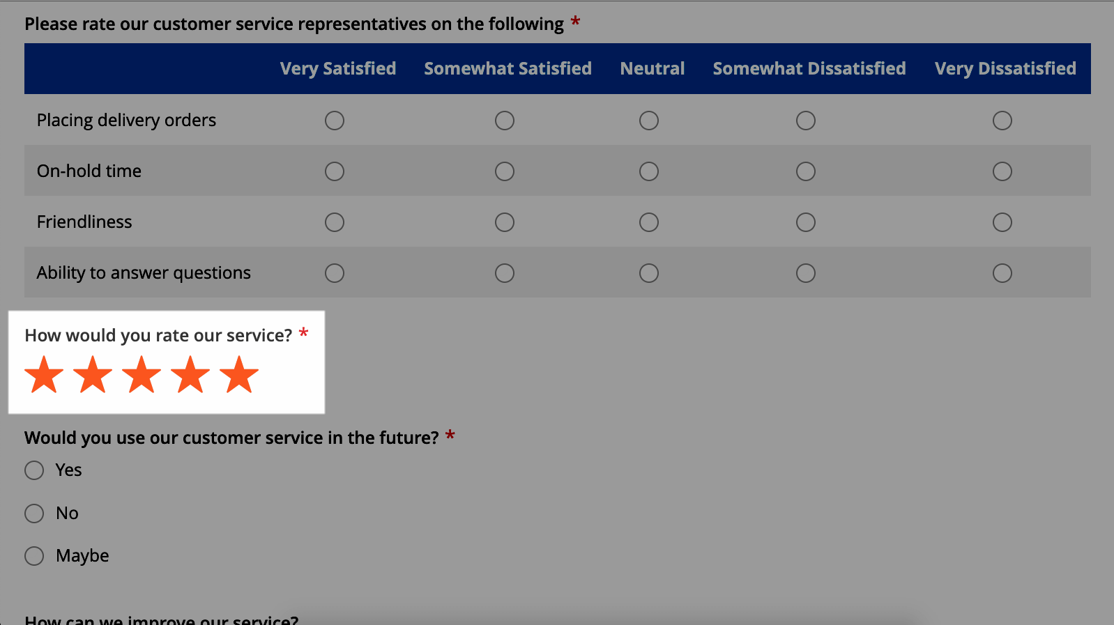 Ex: In a delivery feedback form, if customers rate your service with 2 stars or fewer, a field will appear for them to complete with further explanations. If they select more than 2 stars, they won't see this extra field. Then, they can continue to fill out the form.