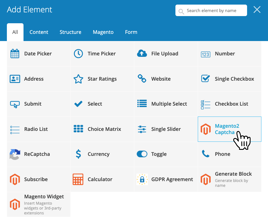 Blue Form Builder makes it more time-saving by configuring Magento 2 Captcha into an element. All you have to do is add this element into your forms.
